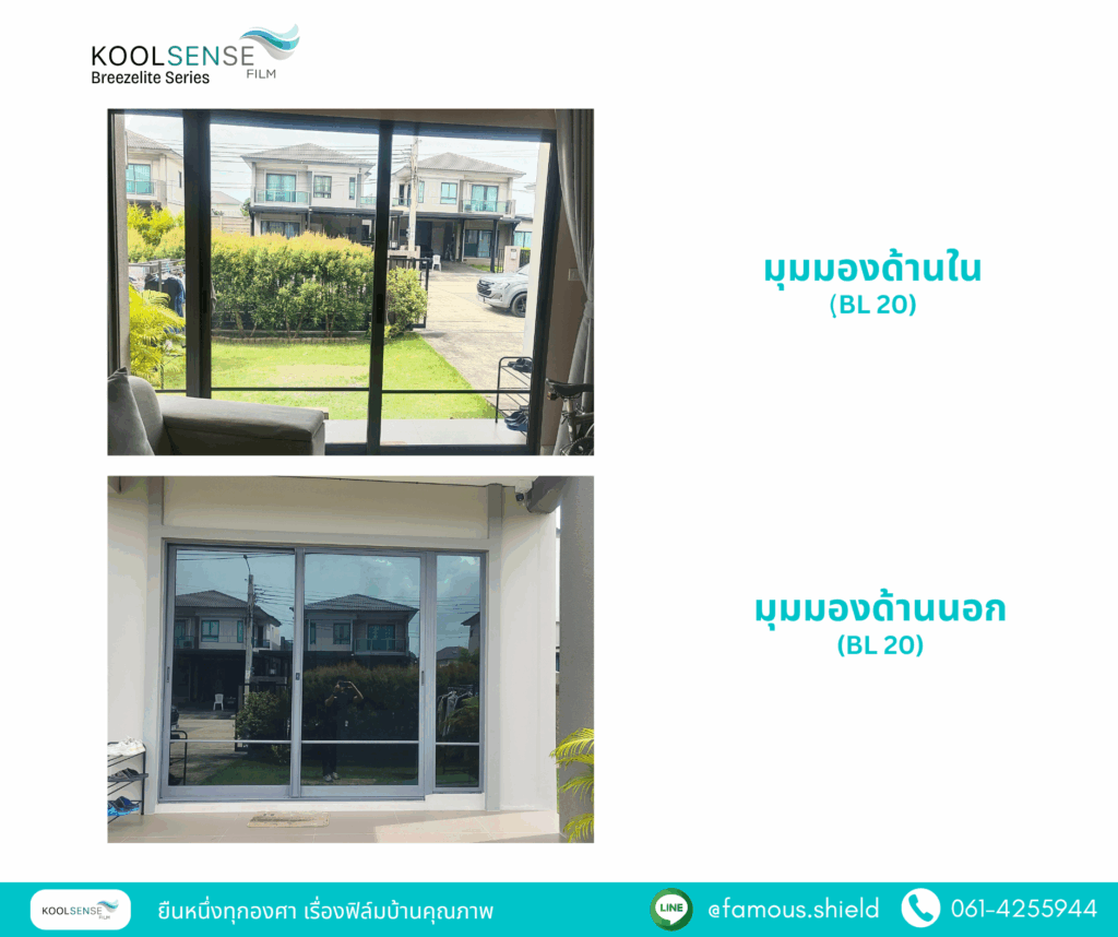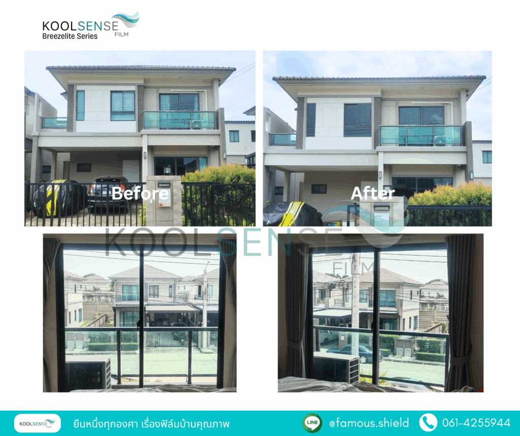 จากภาพ ด้านซ้ายคือฟิล์มคือกระจกที่ยังไม่ติดฟิล์ม โดยลูกค้าเลือกติดฟิล์ม Koolsense Breezelite ชั้น 2 ของบ้านเลือกเป็นความเข้ม 80% และชั้น 1 ของบ้านเลือกเป็นความเข้ม 60%