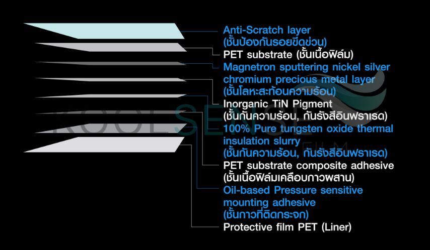 - PET substrate composite adhesive (ชั้นเนื้อฟิล์มเคลือบกาวผสาน) เนื้อฟิล์มซึ่งเคลือบด้วยกาวผสานชนิดพิเศษ มีความใสสูง สามารถรองรับการเคลือบชั้นวัสดุระดับนาโนด้านบน เพิ่มความแข็งแรง การยึดเกาะที่เหนือชั้น และคงประสิทธิภาพการกันความร้อนได้ยาวนาน