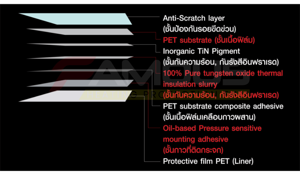 - PET substrate composite adhesive (ชั้นเนื้อฟิล์มเคลือบกาวผสาน)เนื้อฟิล์มซึ่งเคลือบด้วยกาวผสานชนิดพิเศษ มีความใสสูง สามารถรองรับการเคลือบชั้นวัสดุระดับนาโนด้านบน เพิ่มความแข็งแรง การยึดเกาะที่เหนือชั้น และคงประสิทธิภาพการกันความร้อนได้ยาวนาน